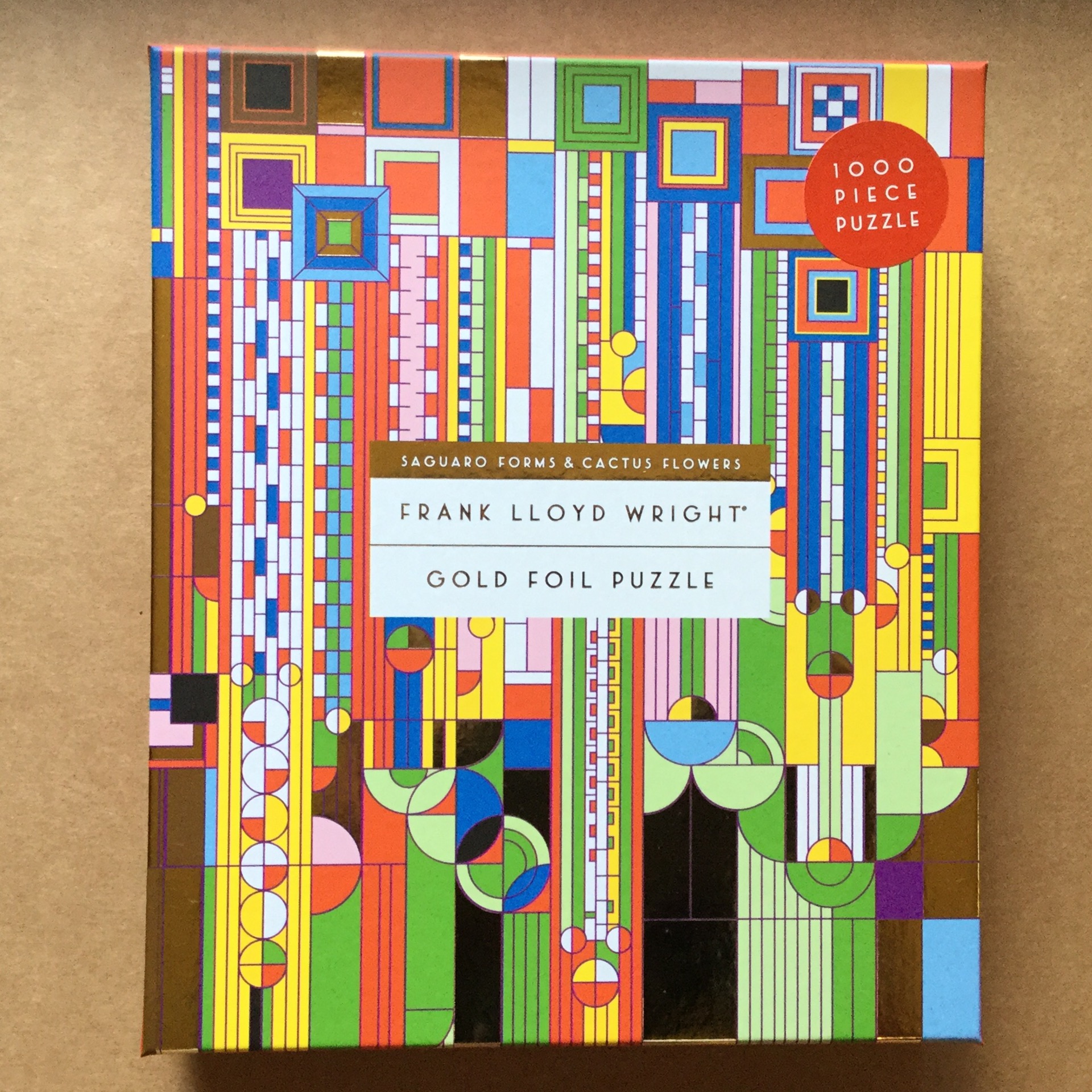 1,000-PIECE PUZZLE: A fun challenge for adults and families, the 1,000-piece jigsaw puzzle features Frank Lloyd Wright’s iconic Saguaro Forms and Cactus Flowers artwork. The bright, colorful and eye-catching finished puzzle measures 20” x 27”.